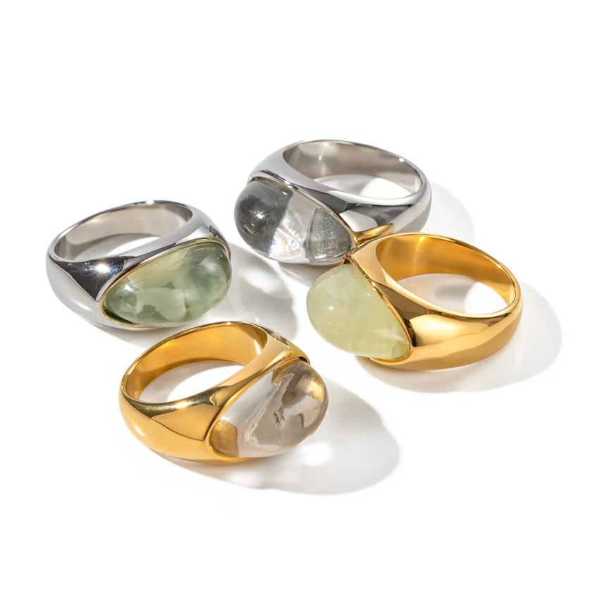 The crystal statement ring is the perfect statement ring for your jewelry collection. With a choice of crystal between jade and clear quartz, and a style choice between silver or gold, gives you the option to pick whichever one fits your personal aesthetic. With a smooth banding design and a statement crystal front, this ring is chic and dependable.