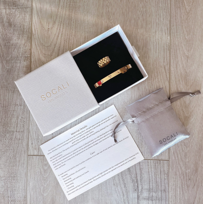 Jewelry Care: When not worn, all jewels are better protected in our SOCALI pouch to prevent impacts and frictions. Each product packed with SOCALI premium pouch, together with material care card.