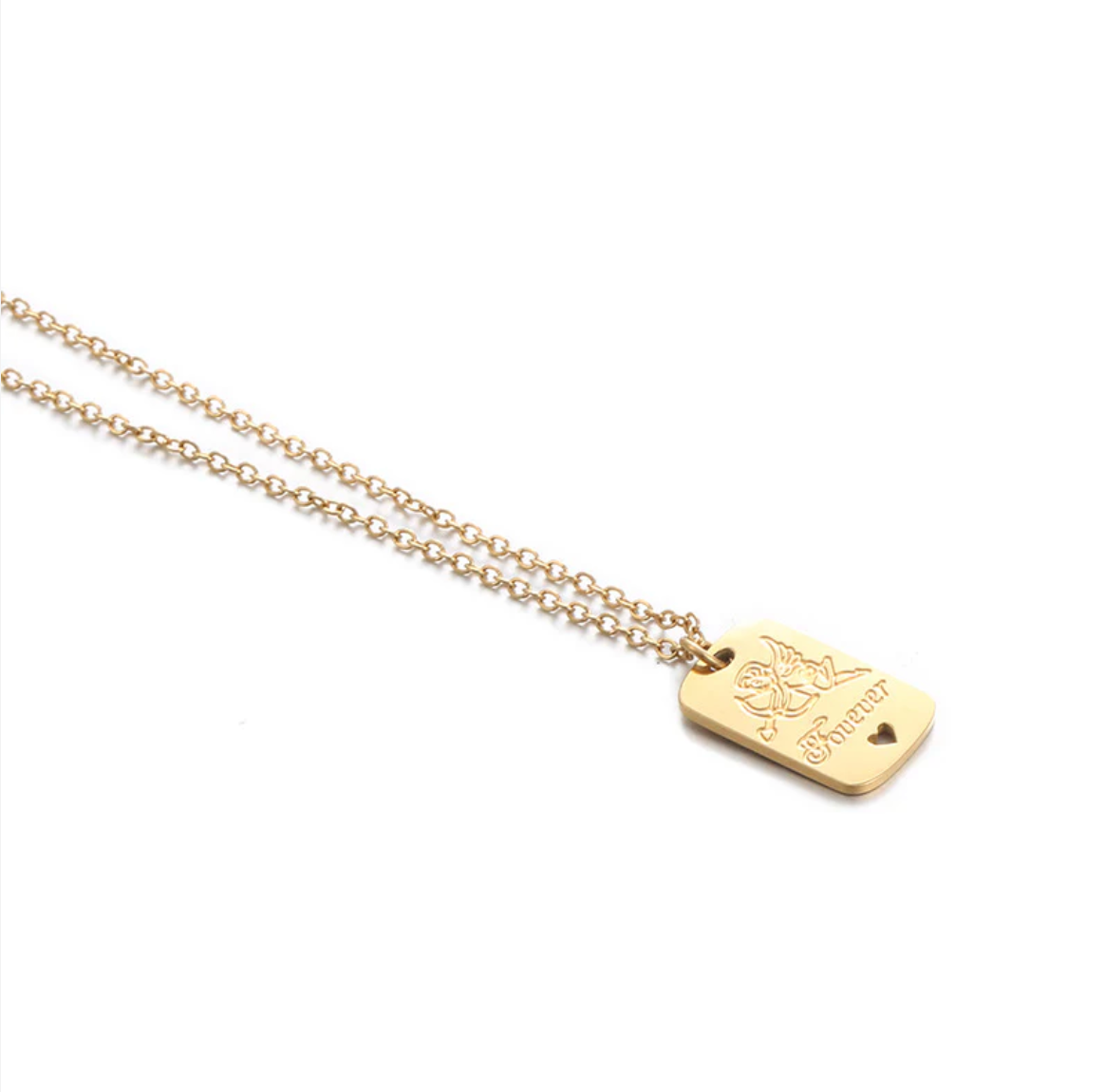 The engraved necklace collection is the perfect stack to add to your jewelry collection. Three styles sold separately. One design is an engraved angel with the word forever. Another design is a circle pendant, and the last is just a simple chain to complete the stack.
